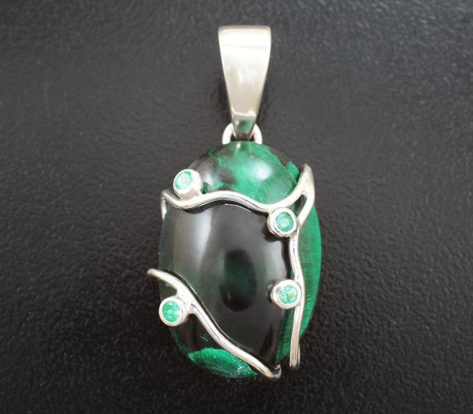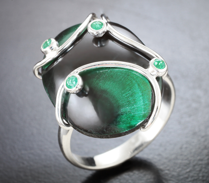 Вашему вниманию предлагается комплект (кольцо + кулон) из стерлингового серебра (925 проба) с плисовым уральским малахитом и изумрудами! Вес комплекта 12,49 г.