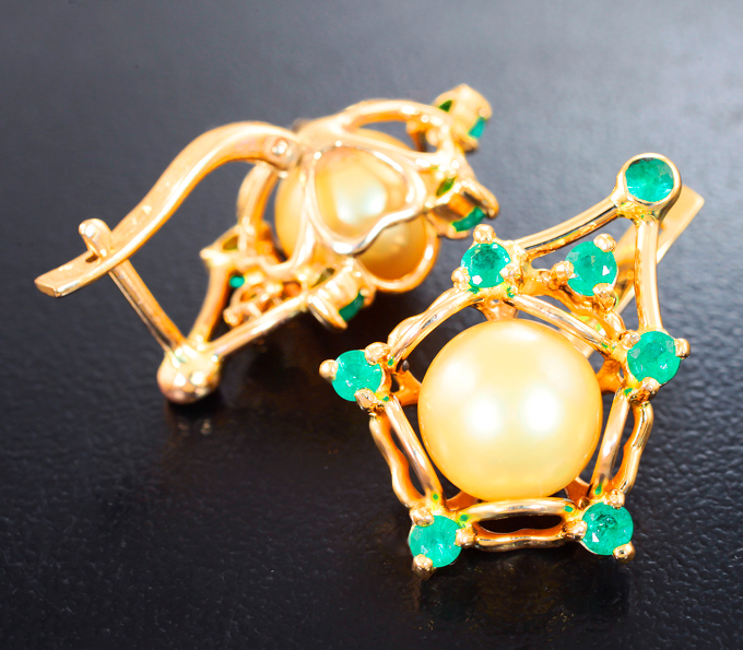 Комплект с золотистым морским жемчугом 14,76 карата и уральскими изумрудами