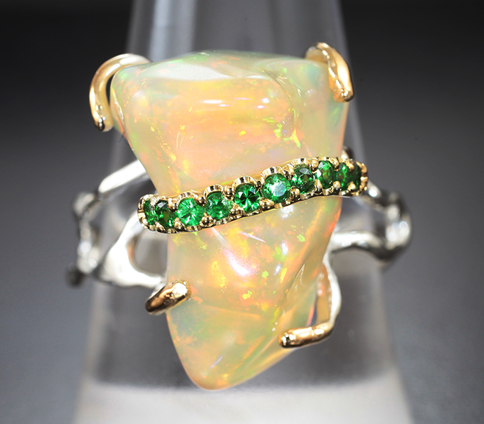 Кольцо с кристаллическим эфиопским опалом 9,87 карата и цаворитами