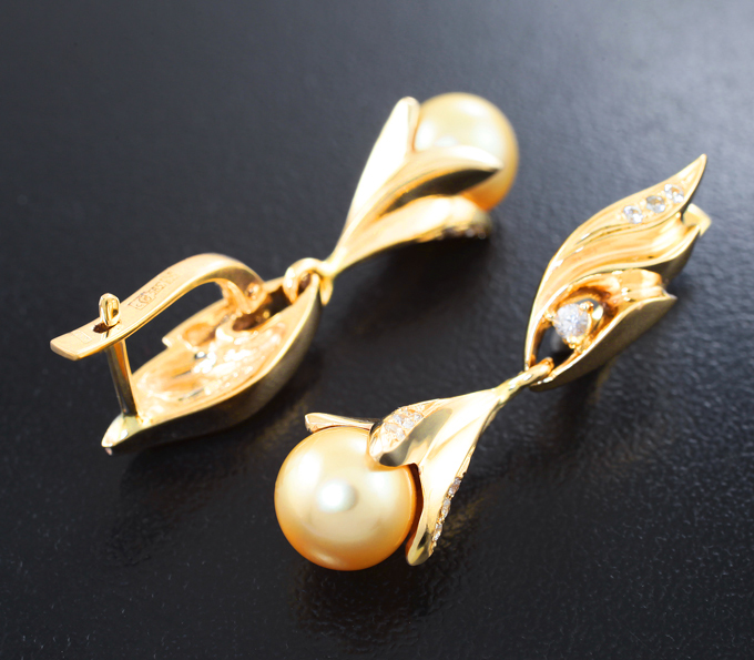 Вашему вниманию предлагаются серьги из желтого золота 585 пробы с золотистым морским жемчугом и лейкосапфирами! Диаметр дополнительной инкрустации от 1 мм до 2 мм. Площадка серег 35 х 10 мм. Вес пары 9,08 г. Ниже приводятся ювелирные характеристики вставок.