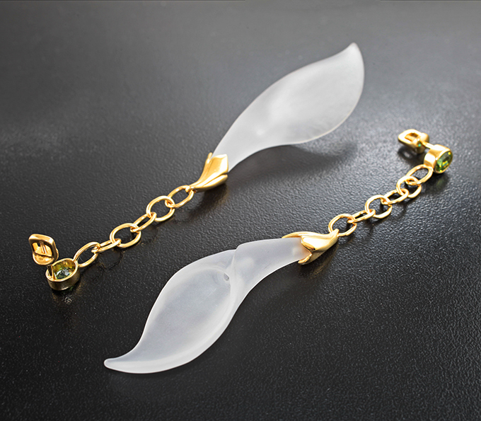 Серьги с резным бесцветным кварцем 58,03 карата и демантоидами гранатами
