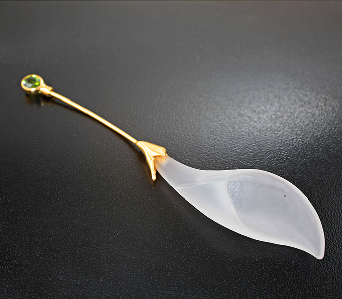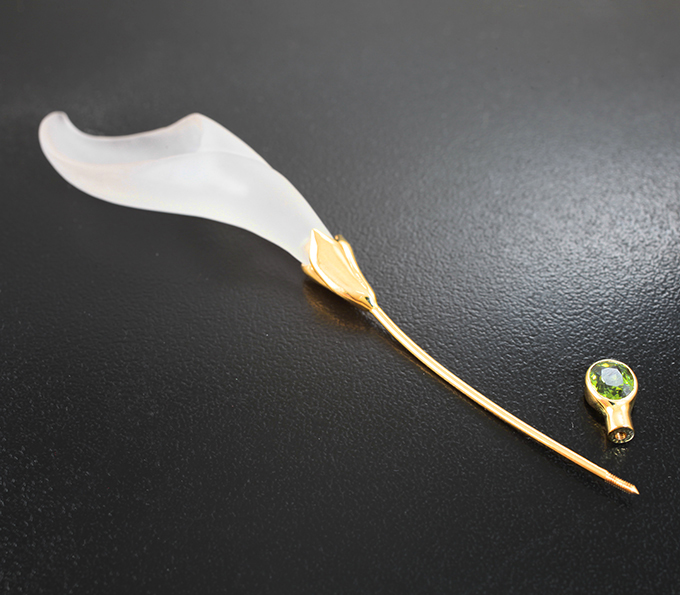 Брошь с резным бесцветным кварцем 28,03 карата и демантоидом гранатом