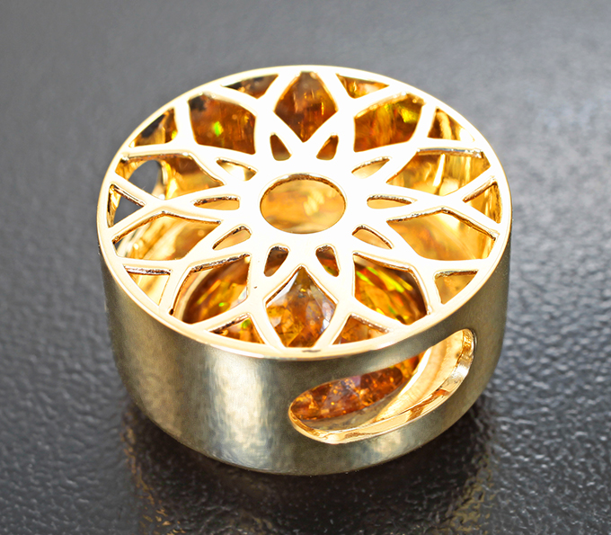 Вашему вниманию предлагается кулон из желтого золота 585 пробы со сфалеритом! Диаметр площадки 21 мм. Вес изделия 12,33 г. Ниже приводятся ювелирные характеристики вставки.