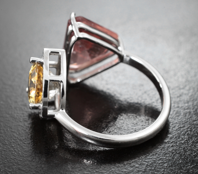 Кольцо с чистейшим синхалитом 1,79 карата и падпараджа апатитом 3,81 карата