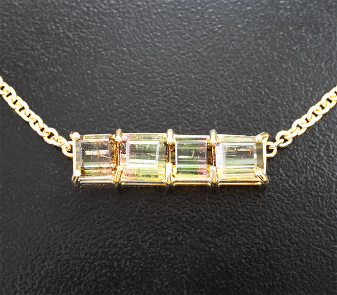 Вашему вниманию предлагается колье из желтого золота 585 пробы с арбузными турмалинами! Длина по цепочке 530 мм. Размеры подвески 24 х 7 мм. Вес изделия 7,4 г. Ниже приводятся ювелирные характеристики вставок.