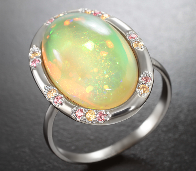 Кольцо с крупным кристаллическим эфиопским опалом 7,39 карата и разноцветными сапфирами