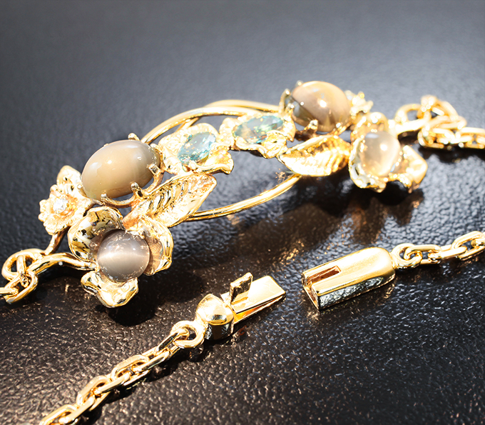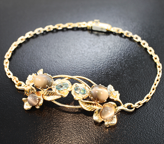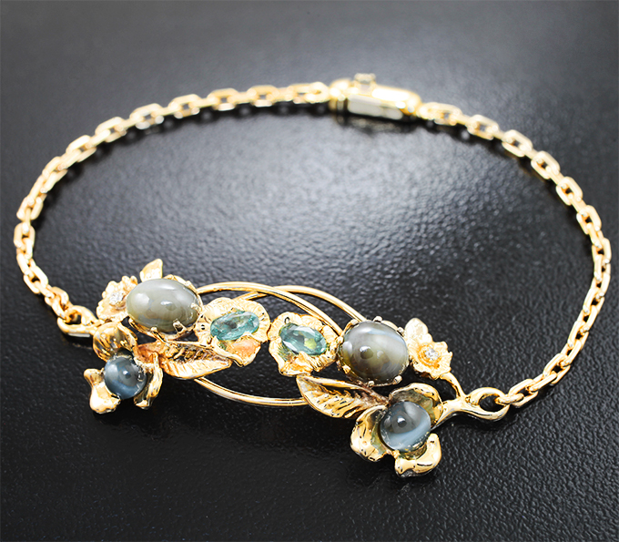 Золотой браслет с хризобериллами с эффектом кошачьего глаза 5,42 карата, топовыми уральскими александритами оттенка морской волны и бриллиантами