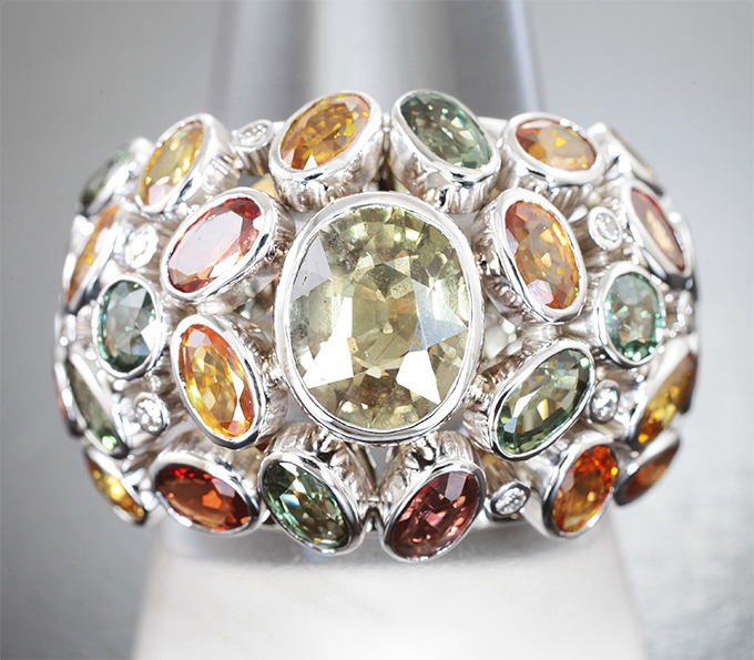 Кольцо с разноцветными сапифирами 13,2 карата и бриллиантами
