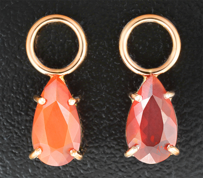 Вашему вниманию предлагаются подвесы для серег из красного золота 585 пробы с ограненными мексиканскими опалами 1,44 карата! Размеры вставок 10 х 5 мм. Размеры изделия 17 х 7 мм. Вес пары 1,17 г.