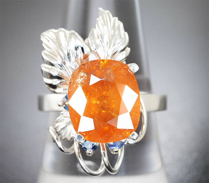Кольцо-трансформер cо спессартином гранатом 6,09 карата и васильковыми сапфирами