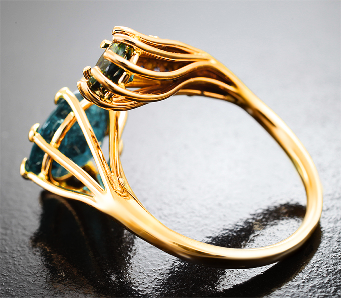 Вашему вниманию предлагается кольцо из желтого золота 585 пробы c индиголитом турмалином и синими сапфирами! Диаметр дополнительной инкрустации от 1,1 мм до 2,1 мм. Ширина площадки 24 мм, высота 9 мм. Вес изделия 6,43 г. Размер 17,75. Ниже приводятся ювелирные характеристики вставки.