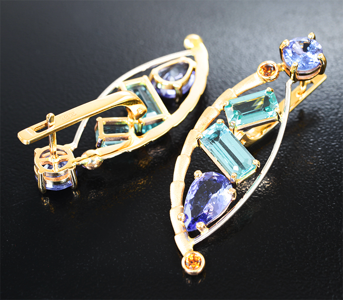 Вашему вниманию предлагаются серьги из желтого и белого золота 585 пробы с «неоновыми» апатитами, танзанитами и цирконами! Диаметр дополнительной инкрустации 2,5 мм. Площадка серег 38 х 13 мм. Вес пары 7,5 г. Ниже приводятся ювелирные характеристики вставок.
