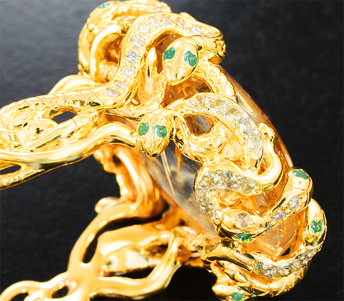 Кольцо с топовым рутиловым кварцем 23,78 карата, желтыми сапфирами, изумрудами и бриллиантами