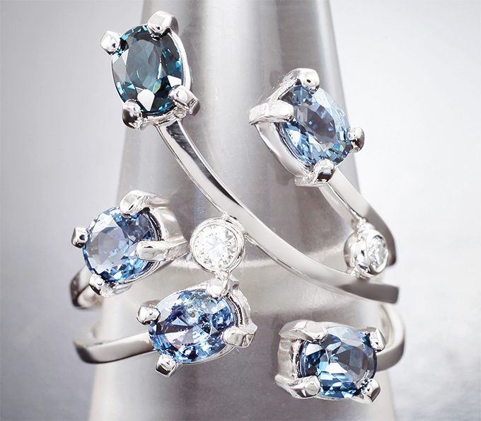 Кольцо с синими шпинелями 2,31 карата и муассанитами