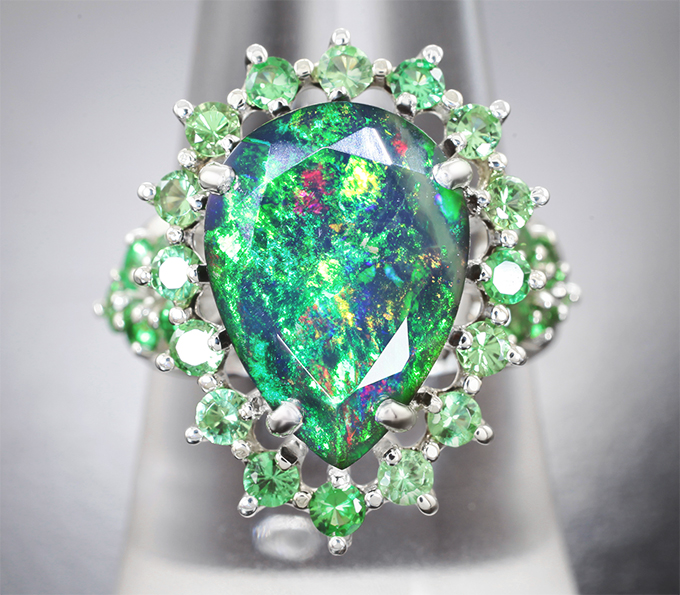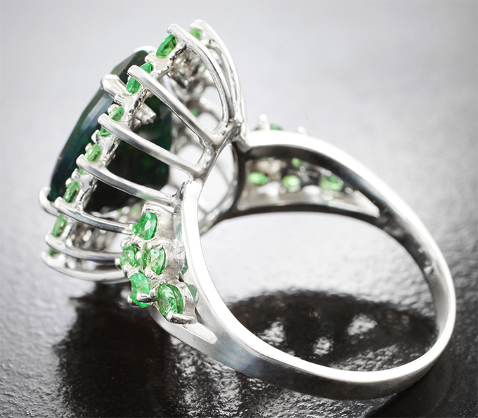 Кольцо с ограненным черным опалом 3,57 карата и цаворитами