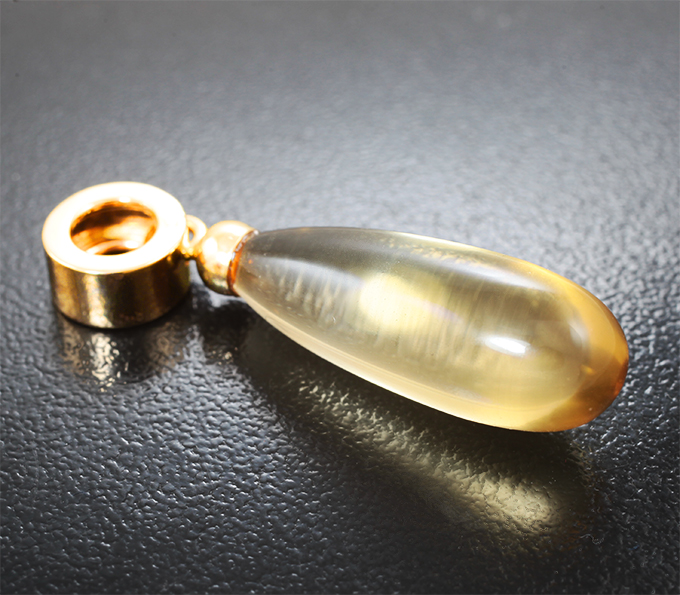 Вашему вниманию предлагается кулон из желтого золота 585 пробы с чистейшим бриолетом цитрина! Размеры кулона с петлей 38 х 9 мм. Вес изделия 5,04 г. Ниже приводятся ювелирные характеристики вставки.