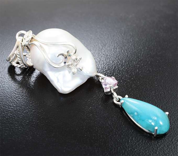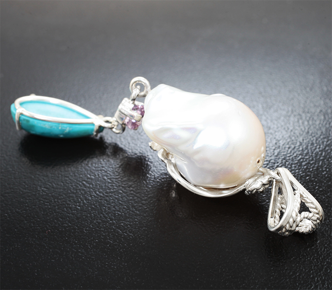 Кулон с кабошоном армянской бирюзы 4,58 карата, чистейшим розовато-пурпурным диаспором 0,7 карата и крупной морской жемчужиной барокко 36,78 карата