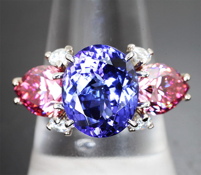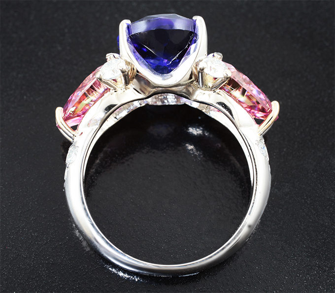 Кольцо с топовым танзанитом 6,46 карата, розовыми 3,92 карата и бесцветными муассанитами 0,6 карата