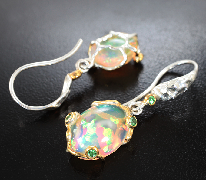 Серьги с кристалличевскими эфиопскими опалами 8,16 карата и цаворитами