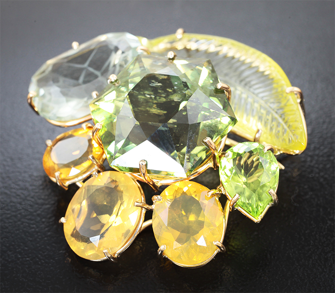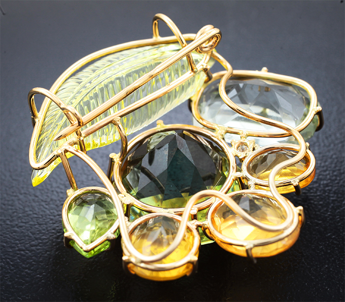 Брошь/кулон с полихромным апатитом авторской огранки 31,06 карата, чистейшим резным цитрином, резным зеленым аметистом, перидотом, ограненными бразильскими опалами и бриллиантом
