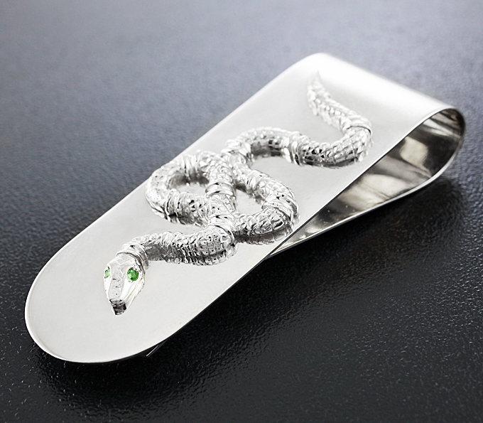 Вашему вниманию предлагается зажим для денег из стерлингового серебра (925 проба) с цаворитами гранатами! Диаметр вставок 1 мм. Размеры изделия 61 х 21 мм. Вес 19,3 г.